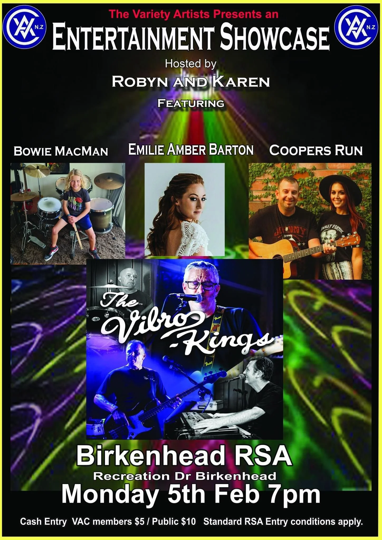 The Variety Artist Club ENTERTAINMENT SHOWCASE will be held on Monday, 5 February 2024 at the Birkenhead RSA, Recreation Drive, Birkenhead.